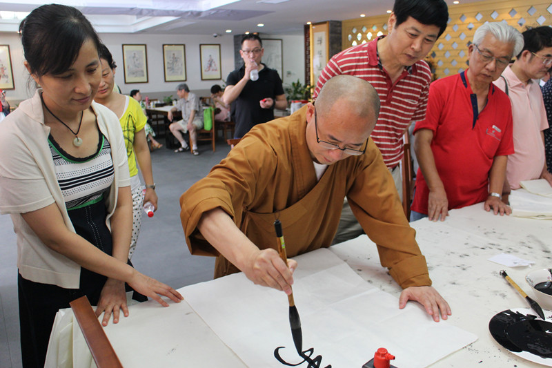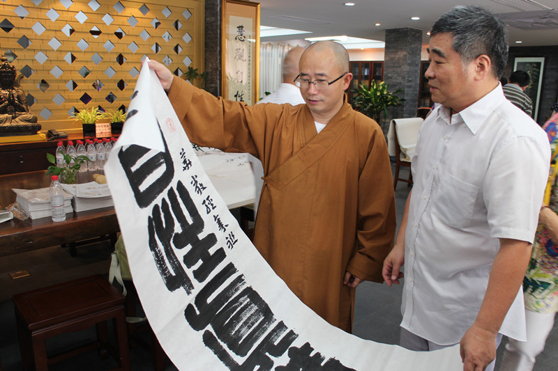朱少伟讲道,佛教文化博大精深,九三学社的爱国、民主、科学的宗旨在和谐社会的创建上,与佛教文化也是相通的。嘉定区佛教界与书画结缘已久,书画晨练是诸多僧人的日常必修项,担任菩提寺住持的慧证法师更是在书法领域深耕多年。交流中,慧证法师欣然题写了“千祥云集”四个字,上海九三学院画院的书法家王运天、何高潮、管继平、吴宗麟、蔡剑明、孙燕平、钱建忠等也纷纷挥毫。