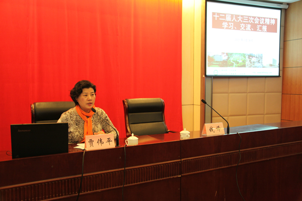 贾伟平介绍了大会基本情况、立法法修改的主要内容、领导讲话精神和上海代表团审议和履职情况。她重点传达了习近平总书记在参加上海代表团审议时的讲话精神。在此次审议中她做了如何构建和谐医患关系和医养结合的主题发言,并提交了涉及《专科医师制度》和《人类辅助生殖技术立法》的建议。