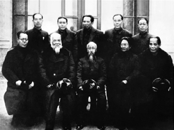 汇聚哈尔滨的部分民主人士。前排左起:李立三、谭平山、沈钧儒、李德全、蔡廷锴。后排左二起:朱学范、章伯钧。左五:赖亚力(冯玉祥秘书)。其他人名不详。