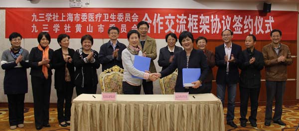 在沪皖两地合作交流座谈会上,社安徽省委副主委张腊梅、社黄山市委主委顾家雯对社市委一行表示欢迎。为开展长期有效的合作交流,经协商,社市委医卫委和社黄山市委签订了2015~2017年合作交流框架协议,并将这一合作工作纳入“沪晥两地九三学社合作共建”总框架。