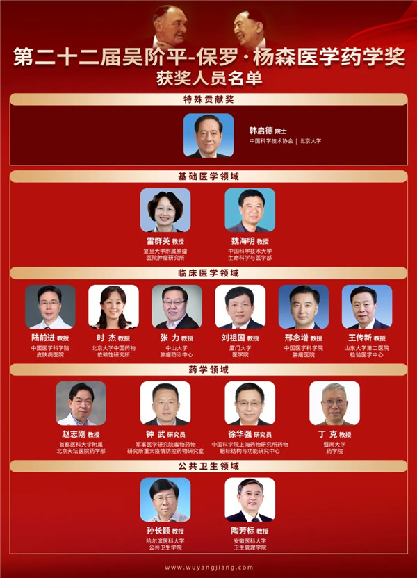 第十、十一届全国人大常委会副委员长,第十二届全国政协副主席、中国科学技术协会名誉主席、北京大学前沿交叉学科研究院院长、北京大学科学技术与医学史系主任,九三学社中央原主席韩启德院士获吴杨奖特殊贡献奖,以表彰其在分子药理学与心血管基础研究领域的重要贡献,及通过社会医学研究,为推动国家医药卫生体制改革发挥了重要作用,并在近年推动了交叉学科的发展。