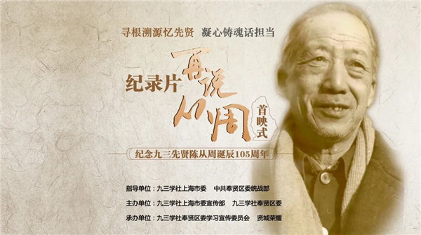 9月21日下午,九三学社上海市委和九三学社奉贤区委共同举办“寻根溯源忆先贤 凝心铸魂话担当”座谈会暨纪录片《寻根铸魂——再说从周》首映仪式。九三学社上海市委专职副主委周锋,嘉定区人民政府副区长、九三学社奉贤区委主委汤东英,中共奉贤区统战部副部长朱丽雅出席活动。