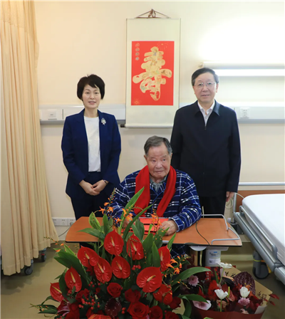 10月12日下午,上海市政协副主席、九三学社市委主委钱锋和中共上海市委统战部常务副部长董依雯专程来到复旦大学附属华东医院,为社中央原副主席、社市委原主委、中国科学院院士杨槱庆祝即将到来的107岁生日。