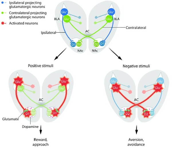 进一步的研究表明,BLA到同侧半球NAc的神经投射主要支配D1型神经元,增加在NAc的多巴胺释放,促进正性奖赏情绪的形成;而BLA至对侧半球NAc的神经投射主要支配D2型神经元,降低NAc的多巴胺水平,而导致负性厌恶情绪的形成。