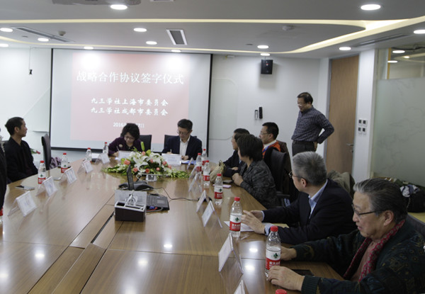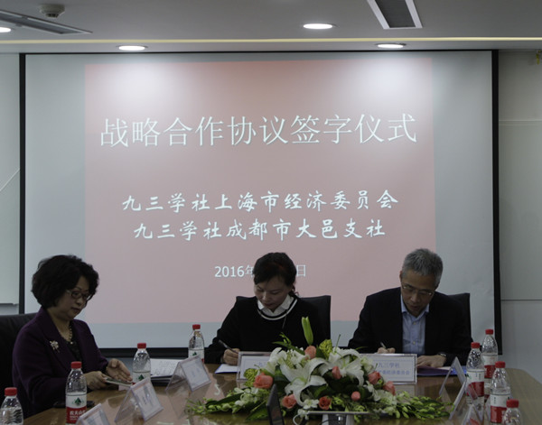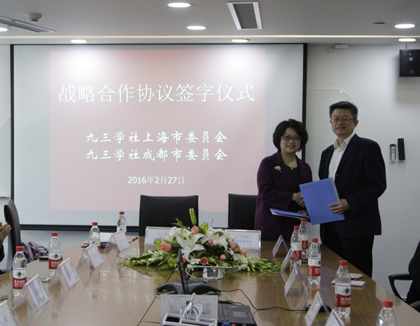 2月27日,九三学社上海市委和九三学社成都市委在上海签署了战略合作协议。社上海市委副主委周锋、秘书长朱红,社成都市委副主委张平出席签约仪式并讲话,社中央参政议政部综合处处长屠雨迅,社中央经济专委会副主任、中共中央统战部舆情评议员龚震,社中央人资环卫专委会副主任、国际气候战略中心综合部副主任邹晶,社江西省副主委肖礼庆,社上海市委常委、上海市政协提案委员会常务副主任黄鸣,社上海市委常委、社市委金融委员会主委、经济专委会主任、海通证券股份有限公司副总裁、首席经济学家李迅雷,社上海市委经济委员会顾问梁恭杰,社上海市委经济委员会副主任吕颂宪,社陕西省委参政议政部部长曹增武,社天津市委参政议政部长林健,社福建省委调研处处长官宝斌,社成都市委大邑支社主委包蕾等出席仪式,签约仪式由社上海市委参政议政部部长阎凌云主持。