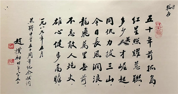 再次回望“五十年前孤岛”战斗岁月,期盼后人铭记历史“不忘敌人炮火”、展望未来“龙飞万里无前”的拳拳心意,跃然纸上。