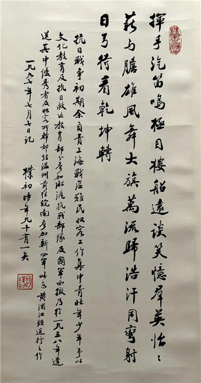 对诗中“曾助新军旗鼓振”,伯父朴老做了详尽的注释:“抗日战争初期,余负责上海战区难民收容工作,先后收容五十万人次。集中青壮年、少年,难民予以文化教育及抗日救亡教育,部分参加淞沪抗战部队。1938年,遣送其中优秀者及收容所干部,经温州前往皖南参加新四军。时新四军初成立,得此助力,威势增强。余数十年后始知,当时中共中央对此有文表扬,然不知是佛教徒之所为也。”