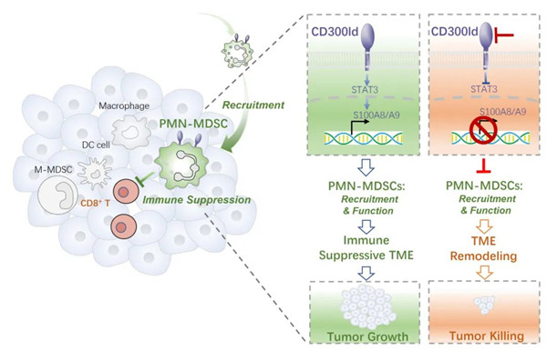 该研究发现了一个全新的、功能高度保守的肿瘤免疫抑制受体CD300ld。CD300ld在PMN-MDSCs上特异性高表达,是调控PMN-MDSCs募集及免疫抑制功能的关键受体。靶向CD300ld能够通过抑制 PMN-MDSCs的募集和功能,重塑肿瘤免疫微环境,从而产生广谱抗肿瘤效果。CD300ld靶点显示出很好的安全性、保守性,抗肿瘤有效性、及与PD1 靶点的协同性,有望成为肿瘤免疫治疗新的理想靶点。