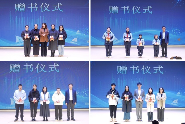 戎伟栋、苏振洪、郑瑛、邱晏等分别为学生代表、家长代表、教师代表等赠送科普书籍,希望以书香为媒,点燃青少年探索科学奥秘的好奇心与求知欲。