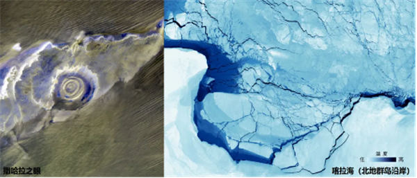 图3 三波段热红外沙漠图像(左) 和单波段热红外海冰图像(右)