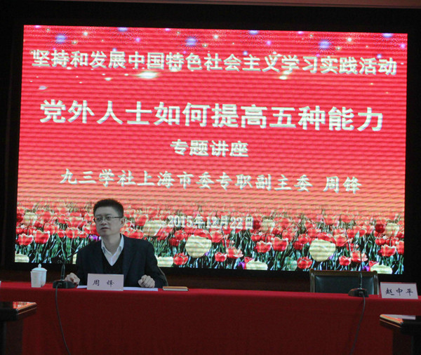 在会后的专题报告会上,周锋结合自身工作经验,同社员们交流了提升“五种能力”的体会。