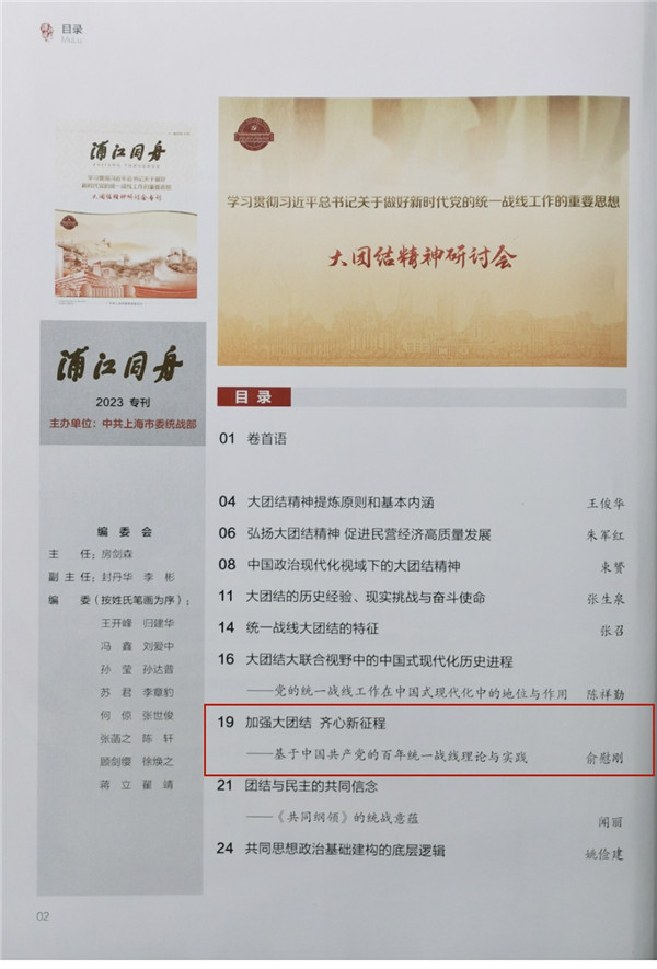 九三学社上海市委精心组织,发挥学习和社史工作委员会专业特色优势,激发社员理论研究兴趣,积极选送征文两篇。其中,九三学社上海市委学习和社史工作委员会副主任、华东理工大学教授俞慰刚撰写的论文《加强大团结 齐心新征程》被收录进《浦江同舟》杂志大团结精神研讨会专刊。俞慰刚应邀出席大团结精神研讨会。