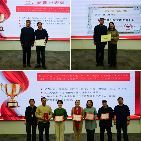 王卫东表示,2024年社华建委员会正式成立,得到社市委、集团党委、历届老主委的支持,他代表委员会班子表示感谢。会议对先进社员和社务工作者进行表彰。其中,施从伟荣获九三学社中央组织工作先进个人称号;委员会被授予九三学社中央宣传部2023年度《民主与科学》杂志发行工作先进集体;陈岚被授予九三学社中央宣传部2023年度《民主与科学》杂志发行工作先进个人;朱家真、刘羽岱、陈希、毕奋、史瑞强、王岚、谈凤捷被委员会授予“优秀社员”称号。除社务工作外,社员们积极在本职岗位上建功立业,荣获了多项市级荣誉称号和奖项。