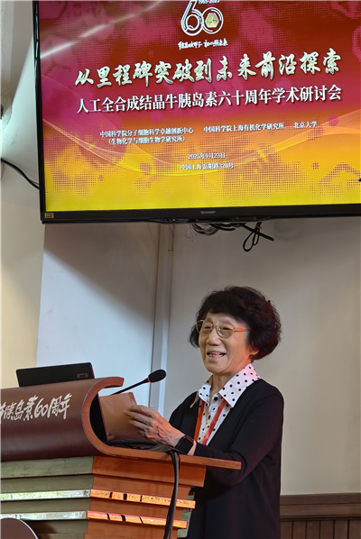 很荣幸能受邀参加人工全合成结晶牛胰岛素六十周年学术研讨会。主持人介绍我是合成牛胰岛素工作的亲历者,是的!那时,人工合成胰岛素项目获得国家机密研究计划代号“601”,中国科学院生物化学研究所(以下简称“生化所”,中国科学院分子细胞科学卓越创新中心前身)全所一盘棋,所有人都参加,各司其职。进行合成、分析鉴定、拆合工作。生化所成立东风生化试剂厂解决原料、试剂,玻璃工场和金木工场解决设备。当时教授先生们领导指挥,为了锻炼我们年轻人,我被任命为B链后8肽合成组的组长,实验室就在这栋楼的二楼朝西。我还记得组员有崔桂芳,还有朱尚权(后任生化所副所长)当时刚从北大毕业,也分配在我组里。后来我由于患了有机溶剂过敏性气喘而脱离了相关工作。回首那段充满激情、日夜奋战的岁月,至今还历历在目,特别亲切!