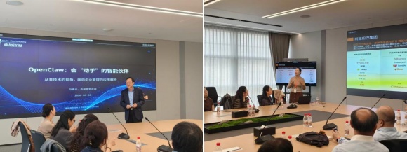 活动伊始,社员们率先参观了阿里巴巴最新的数字展厅,在30分钟的沉浸式体验中,直观感受了阿里巴巴AI技术在诸多领域的场景化落地成果。随后,二支社的两位社员亦加商务咨询(上海)高级咨询师乌建光和阿里集团安全部总监徐臻,分别围绕OpenClaw在企业领域的应用探索、数据时代的安全挑战与实践展开分享,结合实际案例解析了前沿技术如何为企业效率与数据安全保驾护航。
