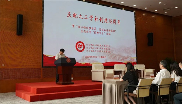 9月1日下午,九三学社上海交通大学委员会、社上海市闵行区委员会、社华东师范大学委员会在上海交通大学文博楼会议中心联合举办庆祝九三学社创建78周年暨“凝心铸魂强根基、团结奋进新征程”主题教育“经典学习”活动。九三学社中央研究室副主任乔发进,社市委专职副主委周锋,副主委刘成良、邵驰,华东师范大学党委统战部部长张惠虹、闵行区委统战部副部长张春燕和上海交通大学党委统战部副部长张杰出席活动。活动由九三学社上海市委文化专门委员会主任刘凝主持。