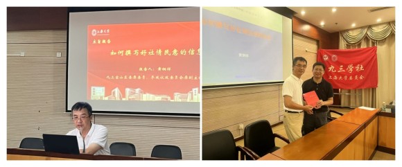 随后举行九三学社上海大学第14期暑期信息工作研讨会。会议特邀了共建单位社员——九三学社宝山区委黄钢祥做《如何撰写好社情民意的信息》主旨报告。黄钢祥结合自己多年提案和社情民意的撰写经历,向与会者分享了自己捕捉社情民意、筛选提炼成信息稿的体会和经验。他认为,信息稿要从个人视角上升到社会视角,寻找社会治理的痛点,正视政府管理的难点,更要从管理视角提出契合现实的、具可行性和操作性、符合政府管理要求的建议对策。他还从为青年社员修改信息稿的经历,分享了写好社情民意信息的方法和体会,让在座的青年社员受益良多。